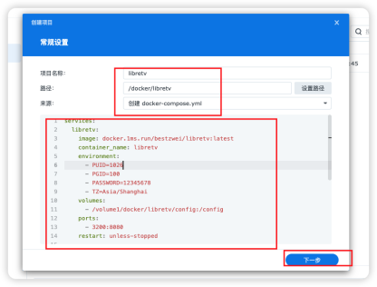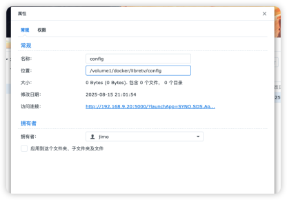 - /volume1/docker/libretv/config:/config(这里冒号前输入刚才记录的config文件夹路径)