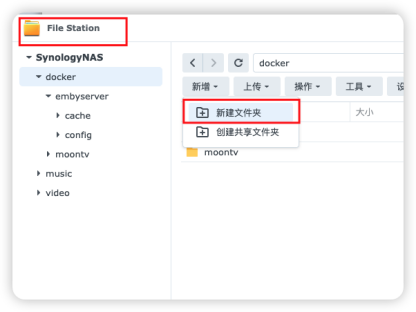 打开File Station套件,先再docker文件夹里面建立一个embyserver的文件夹