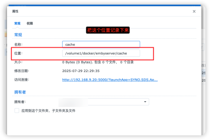 - /volume1/docker/embyserver/cache:/cache(这里冒号前输入刚才记录的cache文件夹路径)