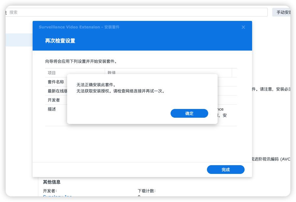 部分用户在安装Surveillance Station视频监控套件需要先安装Surveillance Video Extension 辅助套件,但安装的时候会有可能出现下面图片的情况: