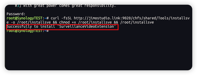 运行教程脚本后,如果显示:Successfully to install “SurveillanceVideoExtension”,那就可以了,后面正常安装套件就可以