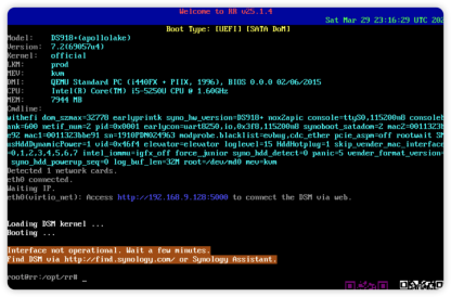 2、出现这个画面,或者出现画面后黑屏,再等2-3分钟,电脑浏览器输入上面蓝色字的ip地址,比如上图的:http://192.168.9.128:5000的地址,进入nas后台。