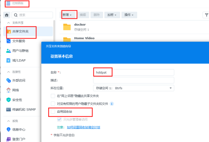进入控制面板——共享文件夹——新建一个hddpat 的共享文件夹(选择存储空间1)