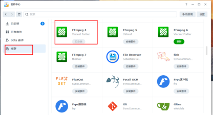 1、先安装ffmpeg的套件(套件中心——社群)