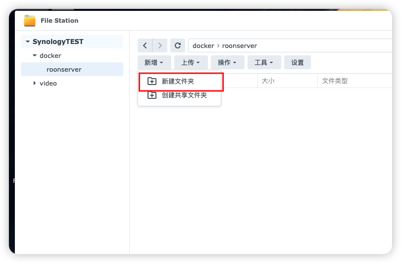 2、打开File Station套件,先在docker文件夹里面建立一个 roonserver的文件夹