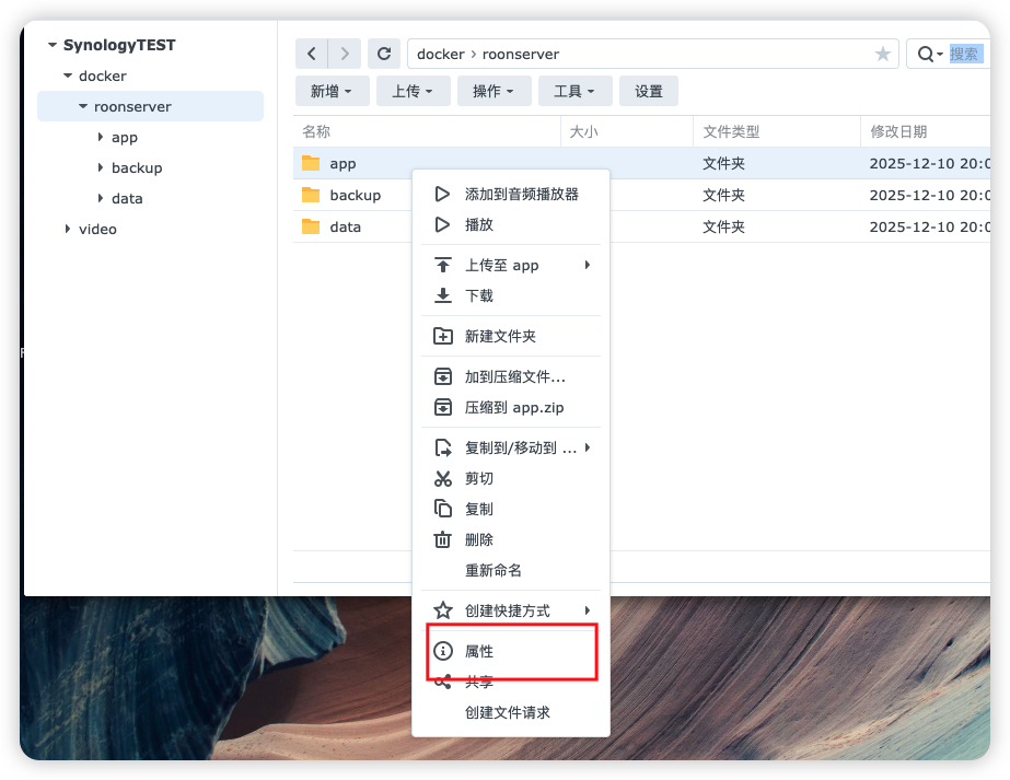 3、记录data 、backup、app 这三个文件夹的正确路径,File Station里面鼠标点击对应文件夹,按鼠标右键,选择属性