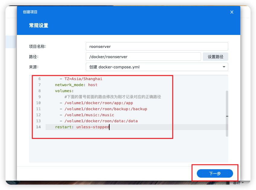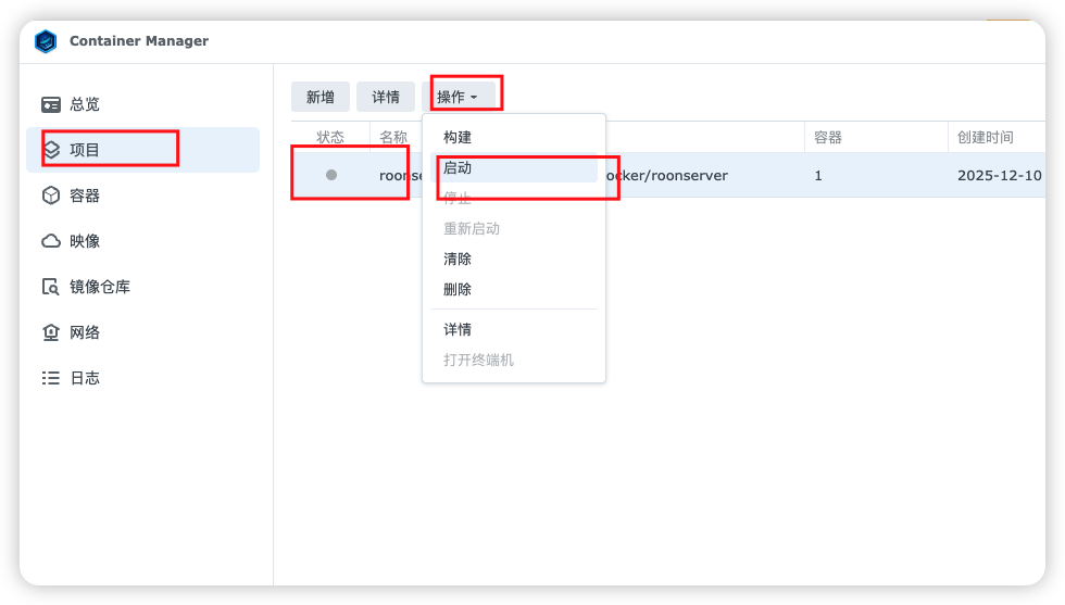 返回ContainerManager选择项目,选择刚才的 roonserv 项目,重新启动项目