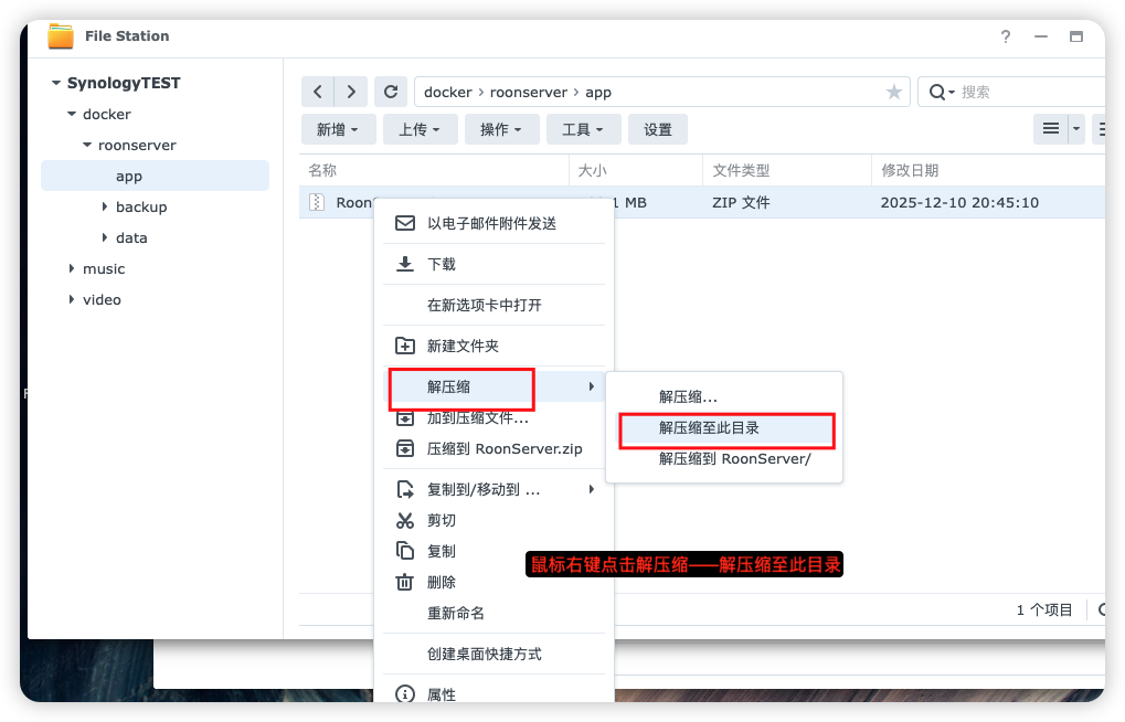 解压刚才拷贝进去的 RoonServer.zip 文件