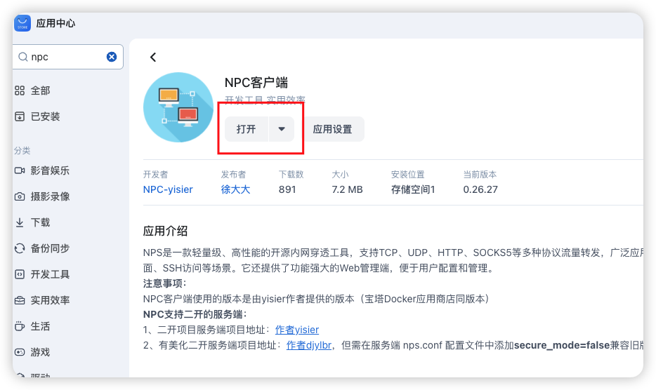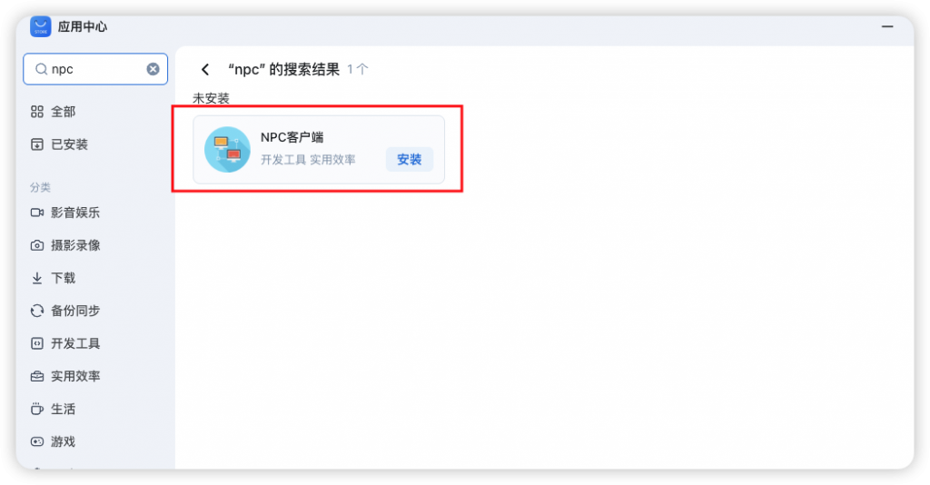 1、进入飞牛系统后台,打开应用中心,通过应用中心安装 npc 客户端 的应用